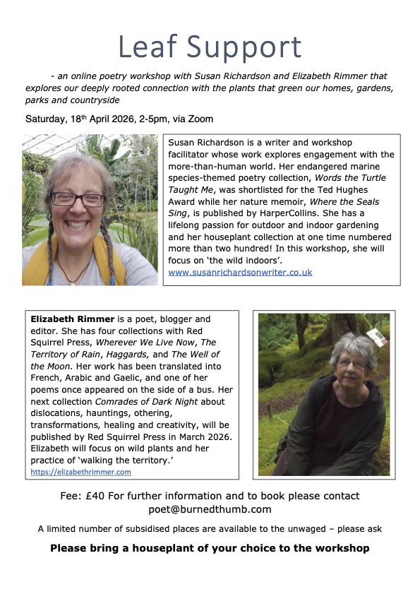 Writer performer and educator Susan Richardson and I are collaborating to offer a poetry workshop on the themes raised by human interactions with plants. Susan will focus on houseplants, and I will consider the wild plants we can find in our locality.